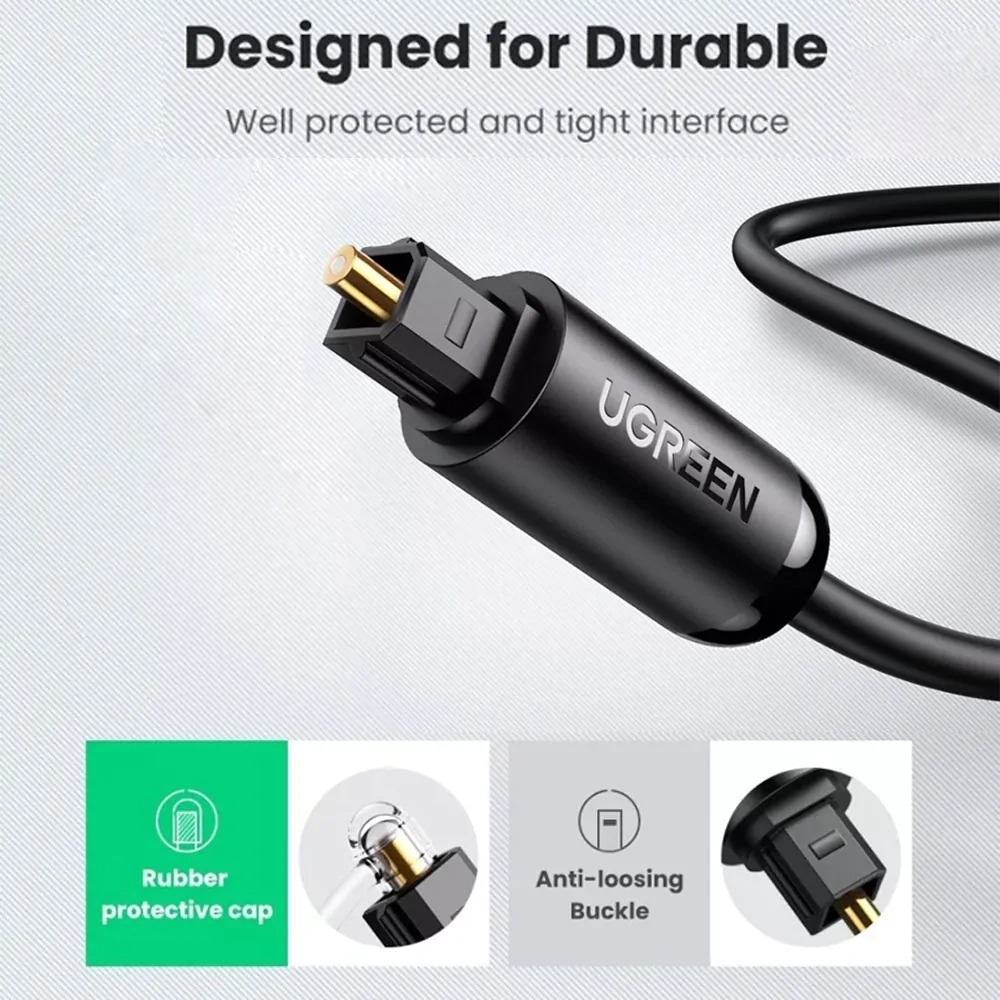 Construção Premium e Durabilidade A Ugreen é sinônimo de qualidade e este cabo reflete isso em cada detalhe. O núcleo de fibra óptica de alta qualidade garante uma transmissão de sinal eficiente e precisa. Externamente, o cabo é revestido por uma camada robusta de PVC preto, que oferece flexibilidade para passar por trás de móveis e racks, ao mesmo tempo em que protege a fibra interna contra quebras e danos por torção. Os conectores são projetados com precisão para um encaixe firme e seguro (“clique” audível), evitando que o cabo se solte acidentalmente. Além disso, as pontas possuem acabamento resistente à corrosão, garantindo uma vida útil longa mesmo em ambientes úmidos.