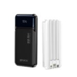 Conectividade Universal sem Cabos Extras Um dos maiores desafios dos carregadores portáteis comuns é a necessidade de transportar cabos que se embaraçam ou são esquecidos. Este modelo soluciona o problema com elegância: ele já possui conectores integrados de alta qualidade. Com saídas compatíveis com dispositivos de última geração (padrão de entrada reversível e conexões específicas para aparelhos de alta tecnologia), você tem em mãos uma central de carga pronta para uso. Além dos cabos embutidos, o corpo do equipamento conta com uma porta de entrada moderna para o seu próprio reabastecimento, permitindo que o conjunto seja recarregado com agilidade.